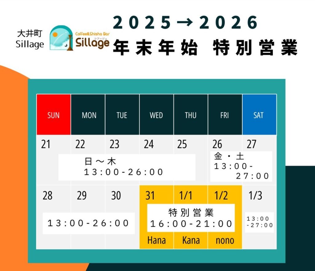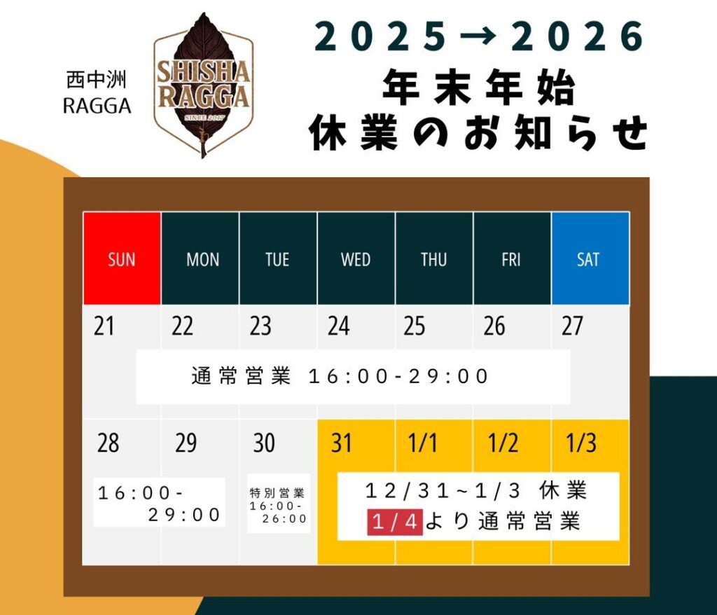 マルキヤ店舗の年末年始営業のお知らせ 2025.12.15 news 都内4店舗→年中無休!12/31~1/2は 16:00-21:00の特別営業☀福岡西中洲RAGGA→12/31~1/3 お休み前後は各店の通常営業時間となっております。残りわずかな2025年も、来る2026年も、その先も末永くお願いいたします!各店営業時間と出勤スタッフ Facebook Twitter LINE hatena prev next